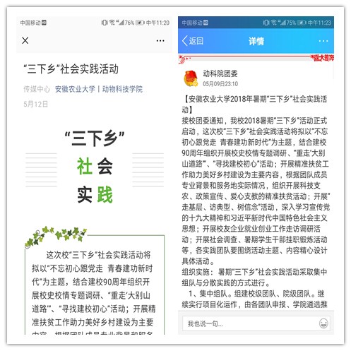 为深入学习宣传贯彻习近平新时代中国特色社会主义思想和党的十九大精神,积极响应校团委《关于组织开展安徽农业大学2018年大学生志愿者暑期“三下乡”社会实践活动的通知》的号召,近日,动物科技学院通过开展暑期“三下乡”动员会、答辩会等系列活动,充分发挥社会实践的育人作用,提高大学生的社会实践能力和思想认识,增强大学生的社会责任感和使命感,进一步推动学院暑期“三下乡”社会实践活动有效开展。5月以来,学院党政领导高度重视,利用辅导员会议、班长团支书会议、党员、学生干部工作例会进行全面部署,精心准备。同时,学院团委通过QQ、微博、微信等新媒体平台广泛宣传、积极动员,旨在帮助学生深入了解“三下乡”的相关知识和重要意义,引导同学深入社会、了解社会、服务社会,在社会实践中锻炼才干,成为更加优秀的动科人。