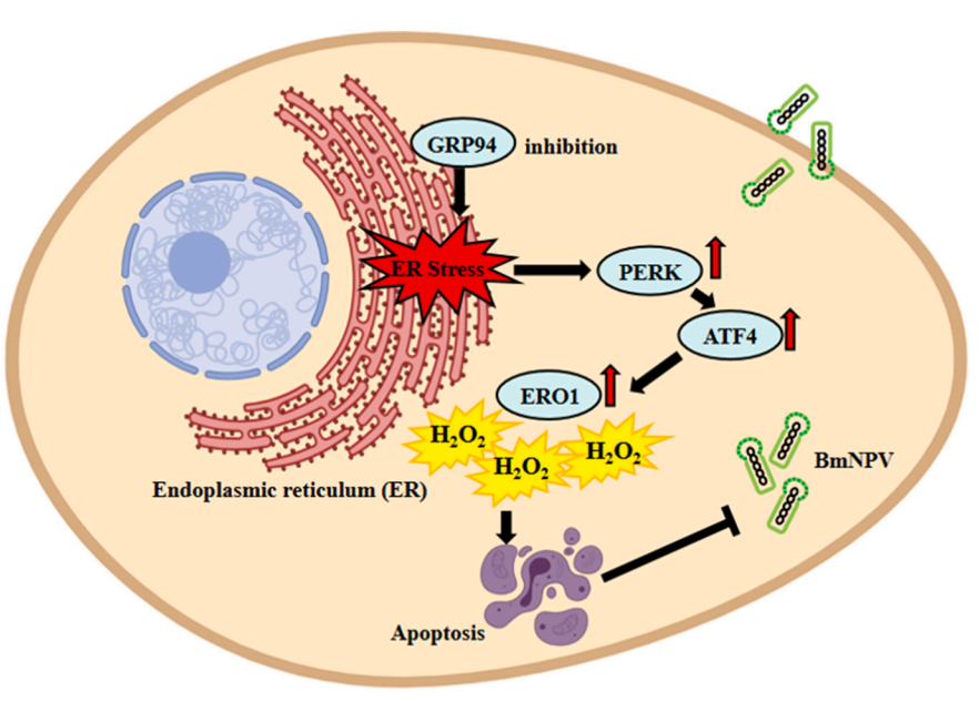 研究解析了BmGRP94与BmNPV感染之间的相互作用,发现BmNPV感染后显著诱导BmGRP94上调表达,进而促进病毒复制。而BmGRP94抑制会引发机体产生ER Stress,表现为 PERK/ATF4/ERO1信号轴的表达增加、钙离子外流以及过氧化氢大量积累,从而促进细胞凋亡,抑制BmNPV在家蚕体内的复制。该研究证明BmGRP94 在促进BmNPV增殖方面发挥重要作用。