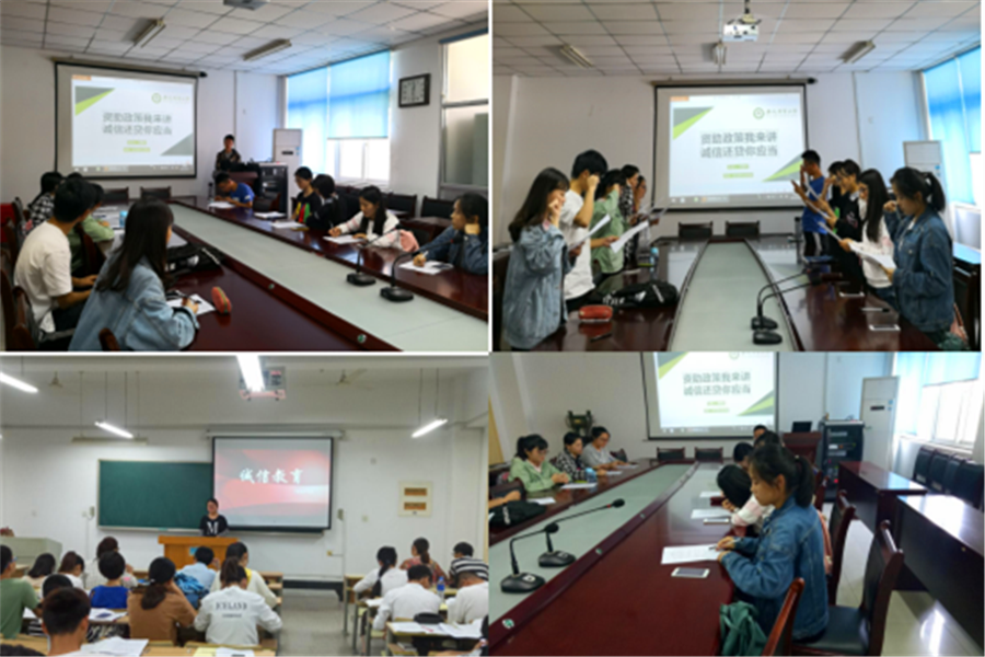 5月,学院开展资助诚信教育系列主题活动。在“资助政策我来讲 诚信还贷你应当”讲座中,团委老师对我校资助政策----奖贷助补免政策进行了详细解读,并对助学贷款的还款流程进行了讲解。在诚信签名活动暨诚信承诺书签订活动中,同学们积极响应,认真阅读并签订了诚信承诺书,立志以实际行动“践诚信”。在诚信宣誓活动中,同学们慷概激昂,进行了神圣而庄严的宣誓。在诚信教育主题班会中,各班通过讲解诚信案例、诚信故事,号召同学们树立诚信观念,发扬契约精神,在接下来的期末考试中做到诚信考试。