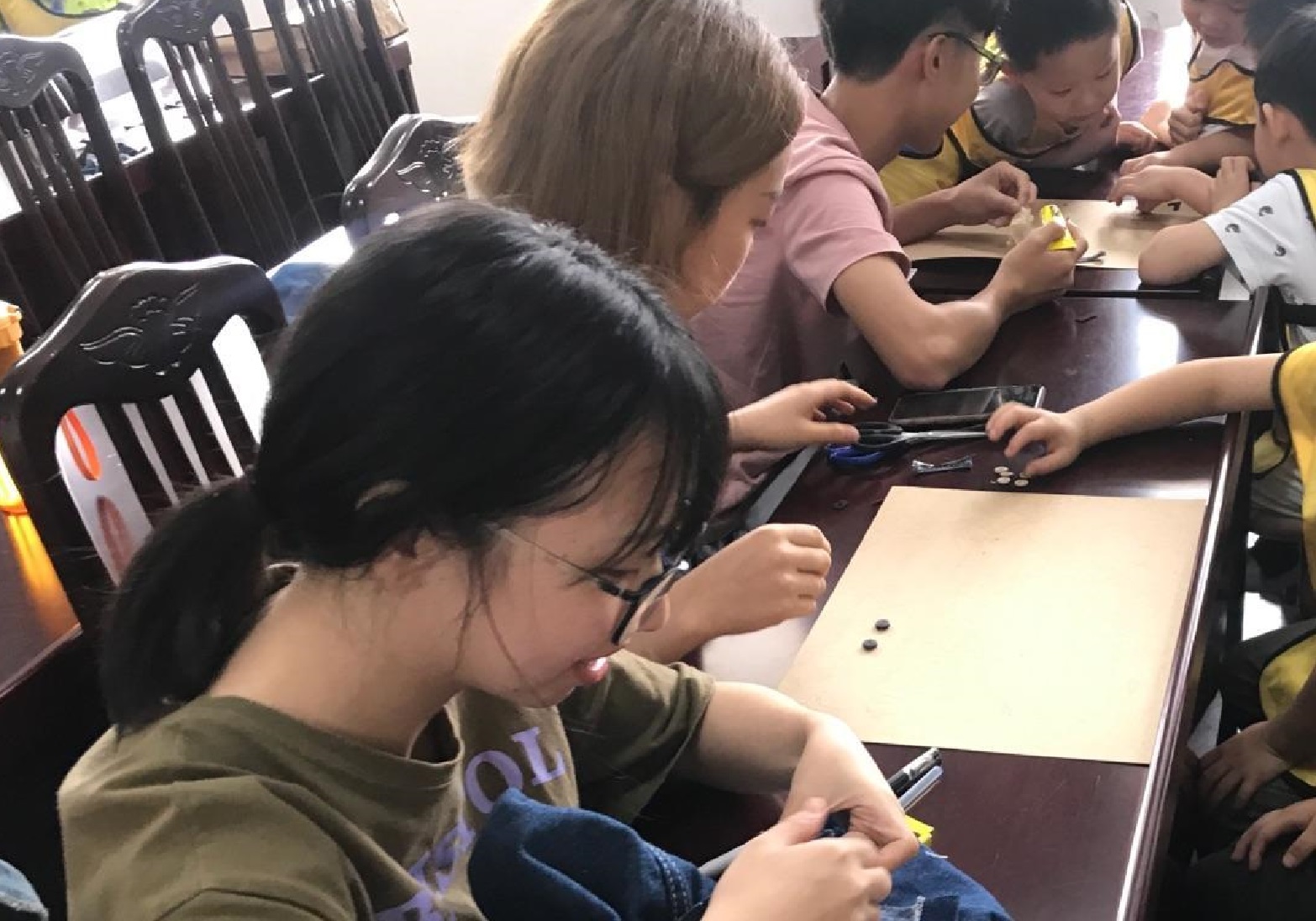 为让小朋友们真切地感受废旧牛仔的魅力,学生第三党支部的党员和积极分子带着小朋友们分成若干组,大手拉小手,一起用智慧和想象来“变废为宝”,制作卡通装饰、笔袋、笔筒、杂物盒等,使废旧牛仔衣物以新的形式得到延续,既实现了废物利用,又得到了美的熏陶。