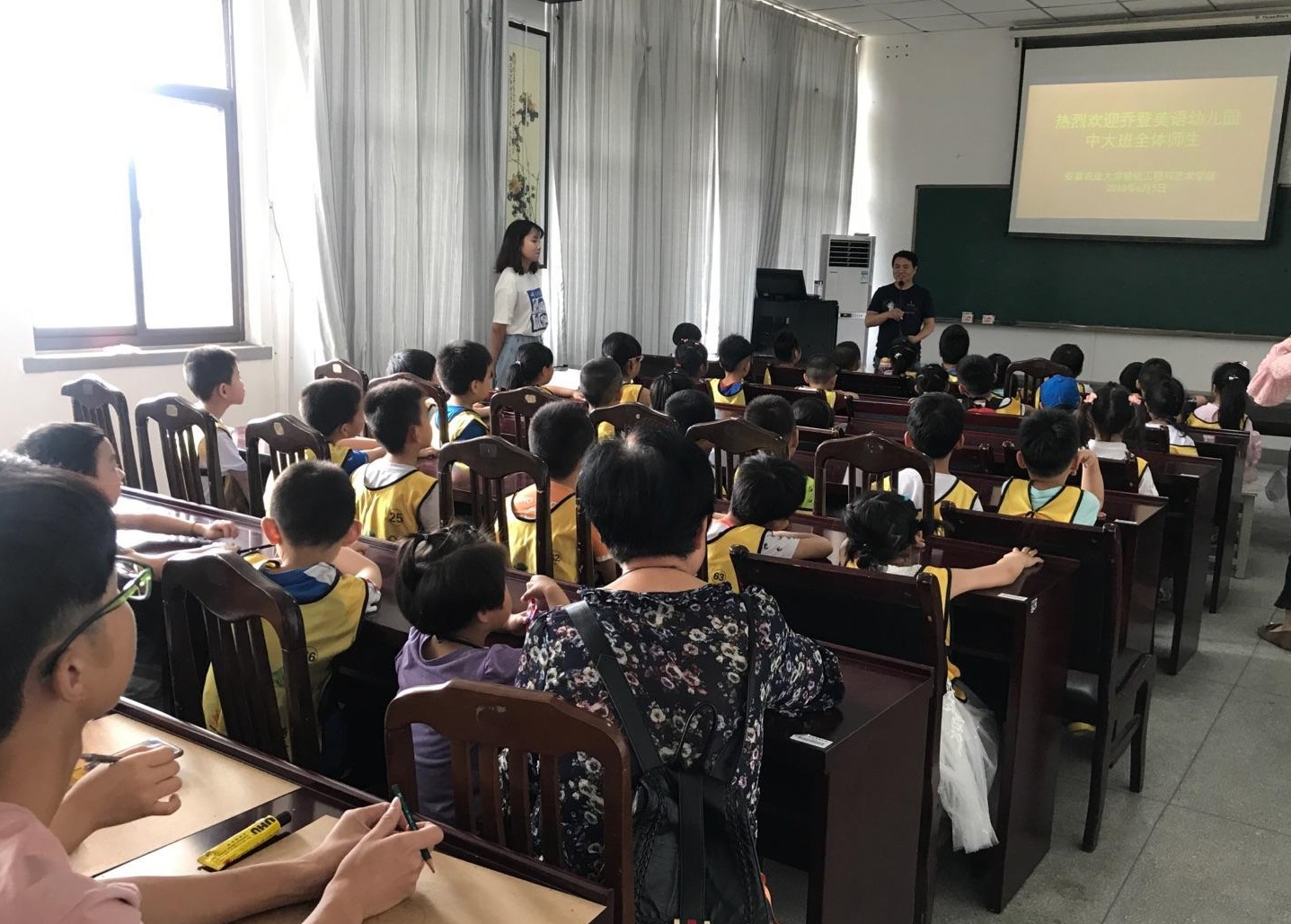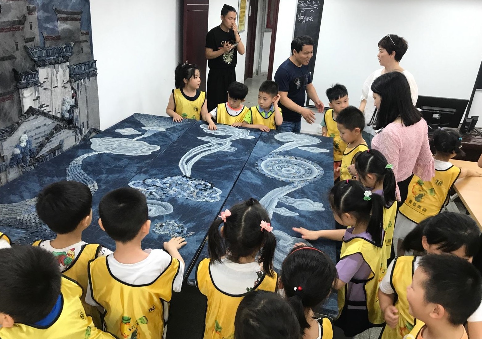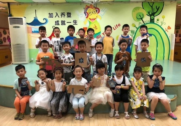 6月5日上午,乔登美语幼儿园的40余名师生来到轻纺工程与艺术学院,院党委委员袁金龙给小朋友们上了一堂生动、有趣的环保课,讲解废旧牛仔衣物在装饰画中的运用,通过互动,让小朋友们了解废旧衣物再利用和环保节约的理念。并带领小朋友走进实验室,参观了袁金龙团队拼布创意设计作品《徽韵》、《再现桃花源》、《“似”水归堂》等,让小朋友们感受创新的魅力。