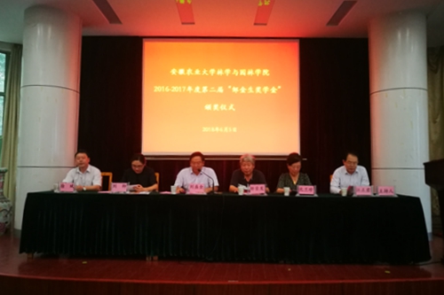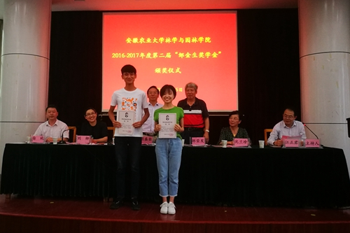 本网讯6月5日,林学与园林学院举行第二届“邹金生奖学金”颁奖仪式,江苏常熟江湾集团董事长邹荣发、财务总监沈兰珍、校学生工作部(处)副处长刘柳、林学与园林学院院长刘盛全、副院长徐斌出席颁奖仪式,林产工业系全体教师、班主任和全体同学参加活动,仪式由院党委副书记江正君主持。