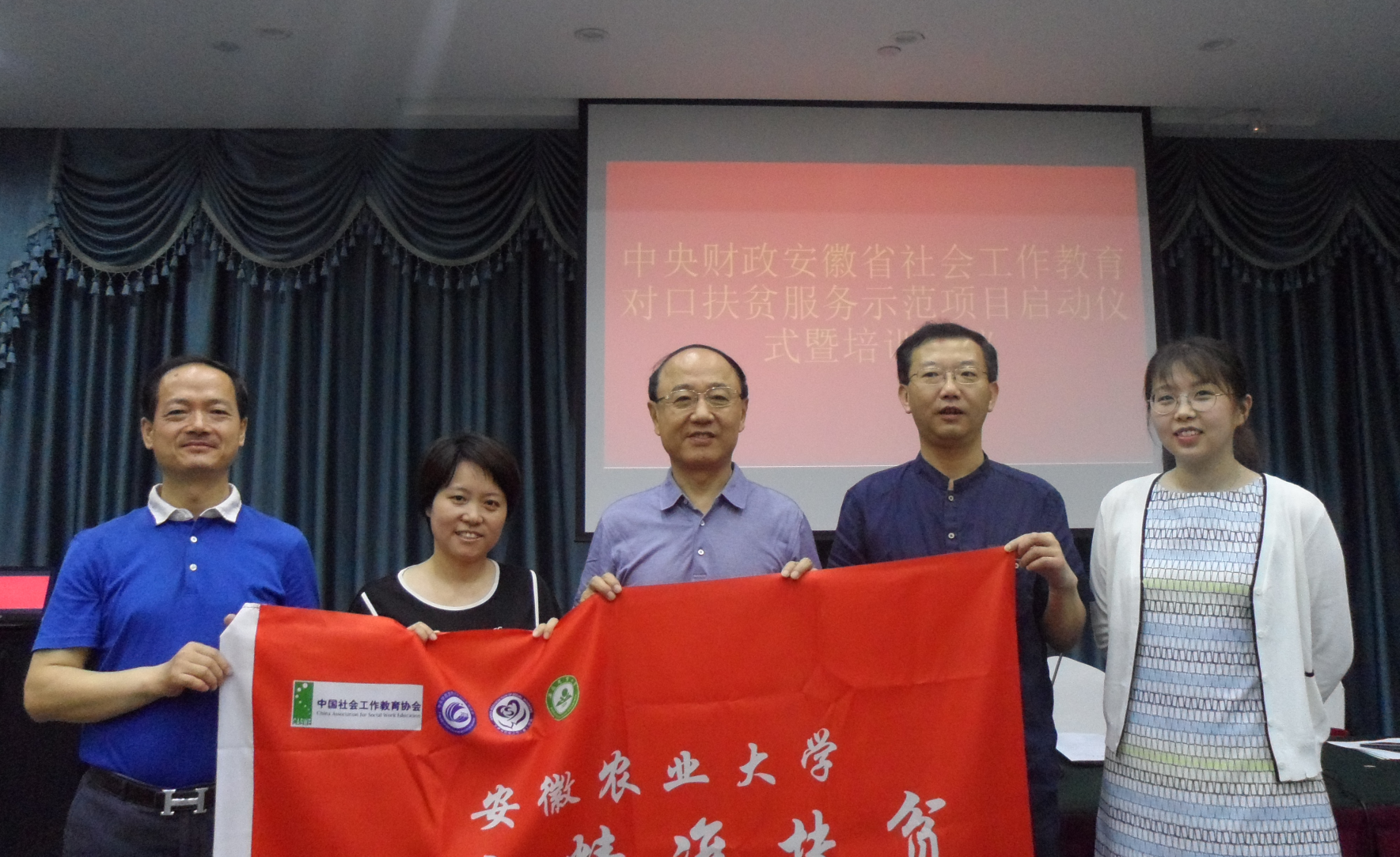 启动仪式上,中国社工教育协会、省民政厅社会工作处、省社工协会领导分别向安徽农业大学等五所高校授旗,标志着安徽省中央财政支持、社会工作教育扶贫项目正式启动,五所高校分别针对前期调研开展汇报交流。