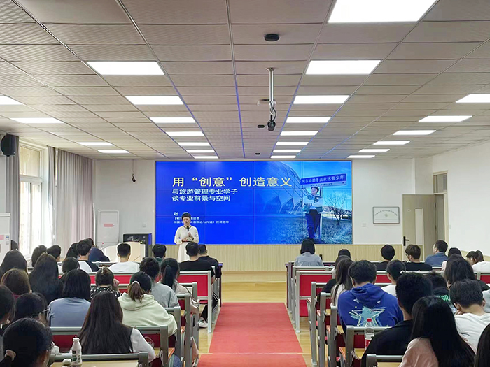 赵媚从文旅创意这一新兴产业赛道切入,突出文化创意与旅游产业的融合特点,据此重新解读旅游管理专业、文旅行业以及未来就业。她从一位传媒向旅游从业转向的亲历者视角,阐述了对旅游管理专业学什么?管什么?等问题的理解,为专业新生梳理了我国旅游业发展的历史进程与未来展望。她提出,旅游行业的就业方向早已超越了传统的酒店、旅行社和景区,旅游管理专业学生的职业未来是多元的,还可以成为文旅创意人、项目管理人、活动策划人等。她将自己的创业选择和经历娓娓道来,希望专业学子能够“用确定的能力,迎接不确定的未来!”。她还从用人单位角度,肯定了我校旅游管理专业毕业学子的表现,并带领在企就业的我专业优秀学子高芯蕾一同与同学们畅聊了专业学习与职业认知。