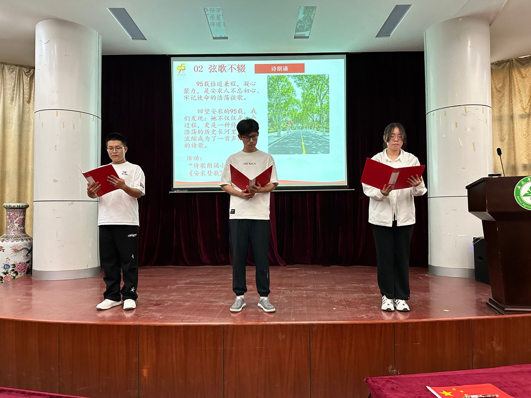 朗诵小组配乐声情并茂地朗诵,感人肺腑。同学们深刻感受到安农95载倍道兼程、凝心聚力,坚守强农兴农初心、勇担乡村振兴使命的浩荡弦歌。