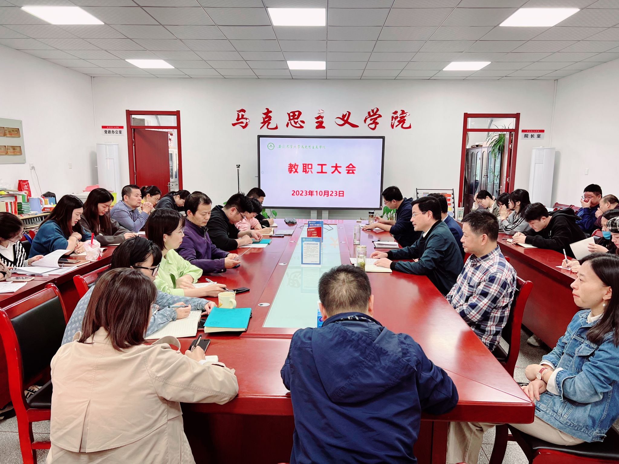 本网讯 10月23日下午,马克思主义学院在人文楼302会议室召开马克思主义学院全体教职工大会,会议由学院党委书记孙超主持,学院全体教职工参加会议。