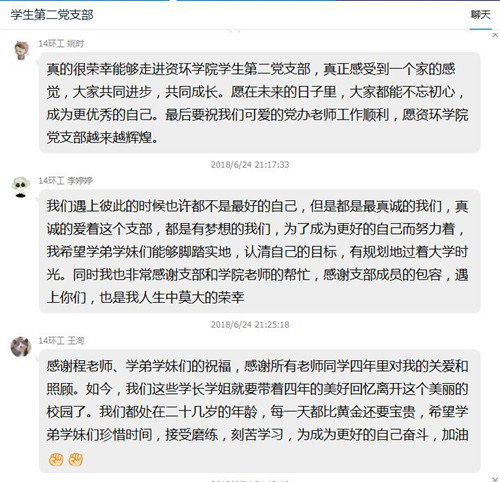 2014级环境科学专业张亚楠:和大家一起度过两年,从支部大会到党员活动,从十教418到图书馆第二报告厅,我们每一次的相聚,都代表着我们党员学习路程更进一步,以后再也不能和大家一起开会,再也不能一起听报告,再也不能听到程玉峰老师的谆谆教诲……毕业就在眼前,感谢老师们的帮助,感谢大家一起陪伴成长,愿老师们身体健康,愿毕业的党员们前程似锦,愿学弟学妹们青出于蓝胜于蓝,愿我们资环学院的党支部愈来愈辉煌灿烂!