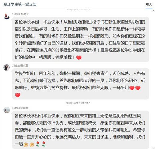 2013级环境科学专业汪雅雯:毕业一年,时间转瞬即逝,2014级的学弟妹们如期迎来了你们的毕业典礼,站在大礼堂接受校长的拨穗,我在直播里看得既感动又怀念。群里的各位都是通过支部考验的有志青年,不论是继续求学还是踏上工作岗位,学姐都希望你们保持一颗炽热的心,为目标不断去奋斗,虽已毕业,但学习不可以“毕业”,梦想不可以“毕业”!祝大家前程似锦。