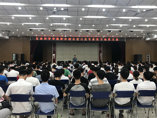 本网讯 6月26日下午,生命科学学院野外综合实习及专业实习动员大会在欣苑四楼小礼堂召开,学院党委书记张健,常务副院长蔡永萍,各系系主任,实习指导老师,各班级辅导员以及我院2015级、2016级全体实习学生参与了动员大会。大会由蔡永萍主持。