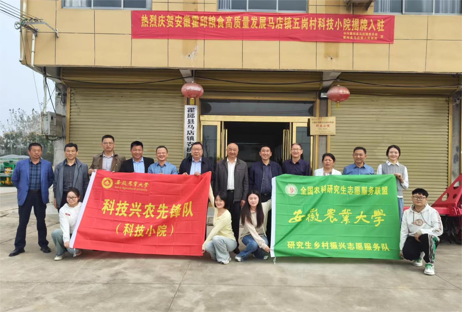 本网讯 10月27日,安徽霍邱粮食高质量发展科技小院在霍邱县五岗村挂牌。霍邱县委副书记、县长韦能武、霍邱县人民政府副县长杨军章,校工会主席刘惠东、党委研究生工作部副部长(主持工作)姜家生,霍邱县相关职能部门、马店镇党政主要负责同志、科技小院专家、驻院学生参加了揭牌仪式。