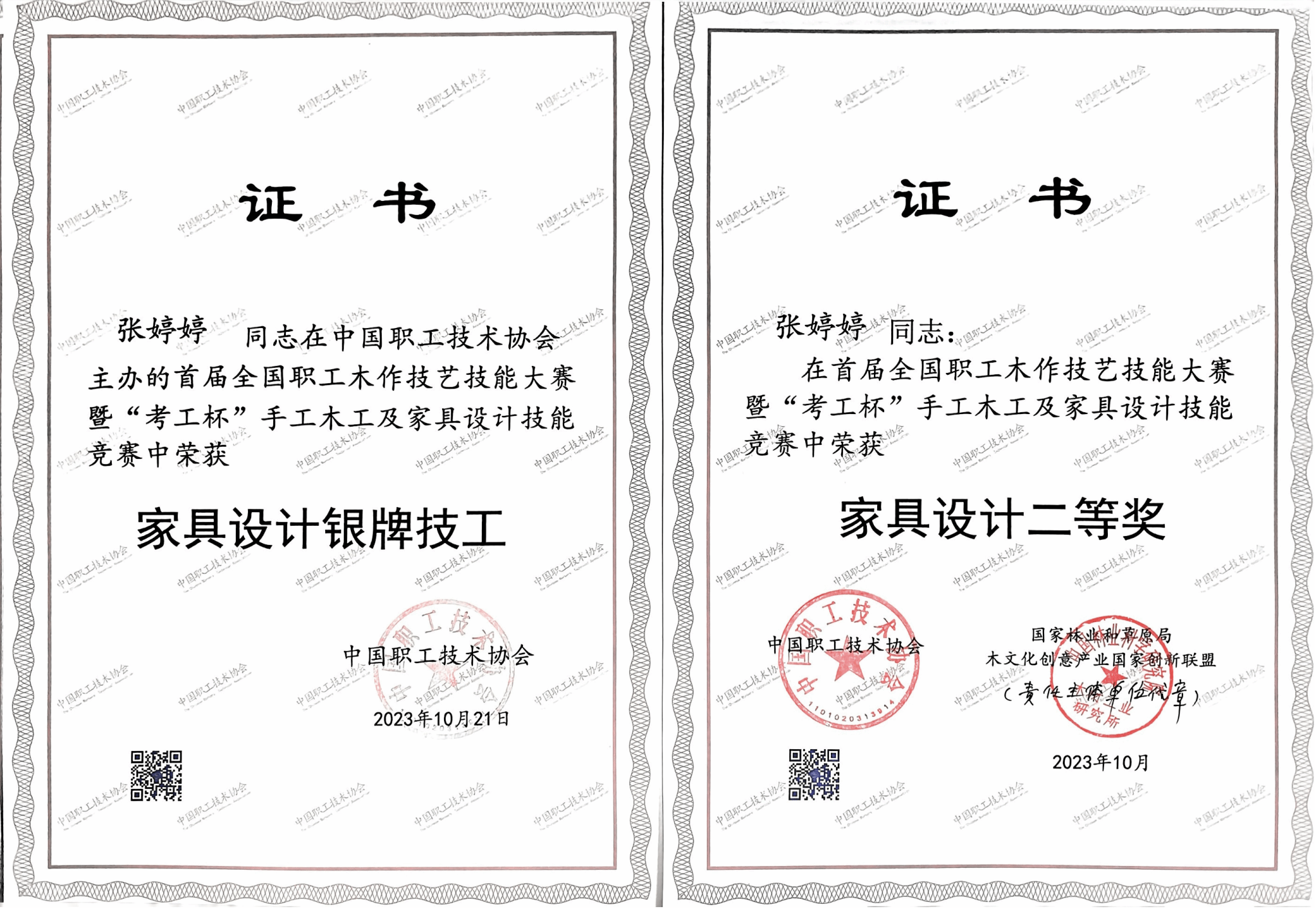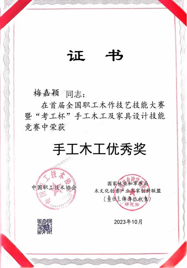 本网讯 10月21日,林学与园林学院2020级木材科学与工程专业张婷婷、2021级木材科学与工程专业梅嘉颖两位同学在郭勇教授、马超老师带队指导下,参加了在北京举办的首届全国职工木作技艺技能大赛暨“考工杯”手工木工及家具设计技能竞赛。张婷婷同学获得家具设计组二等奖、家具设计银牌技工称号,梅嘉颖同学获得手工木工组优秀奖。