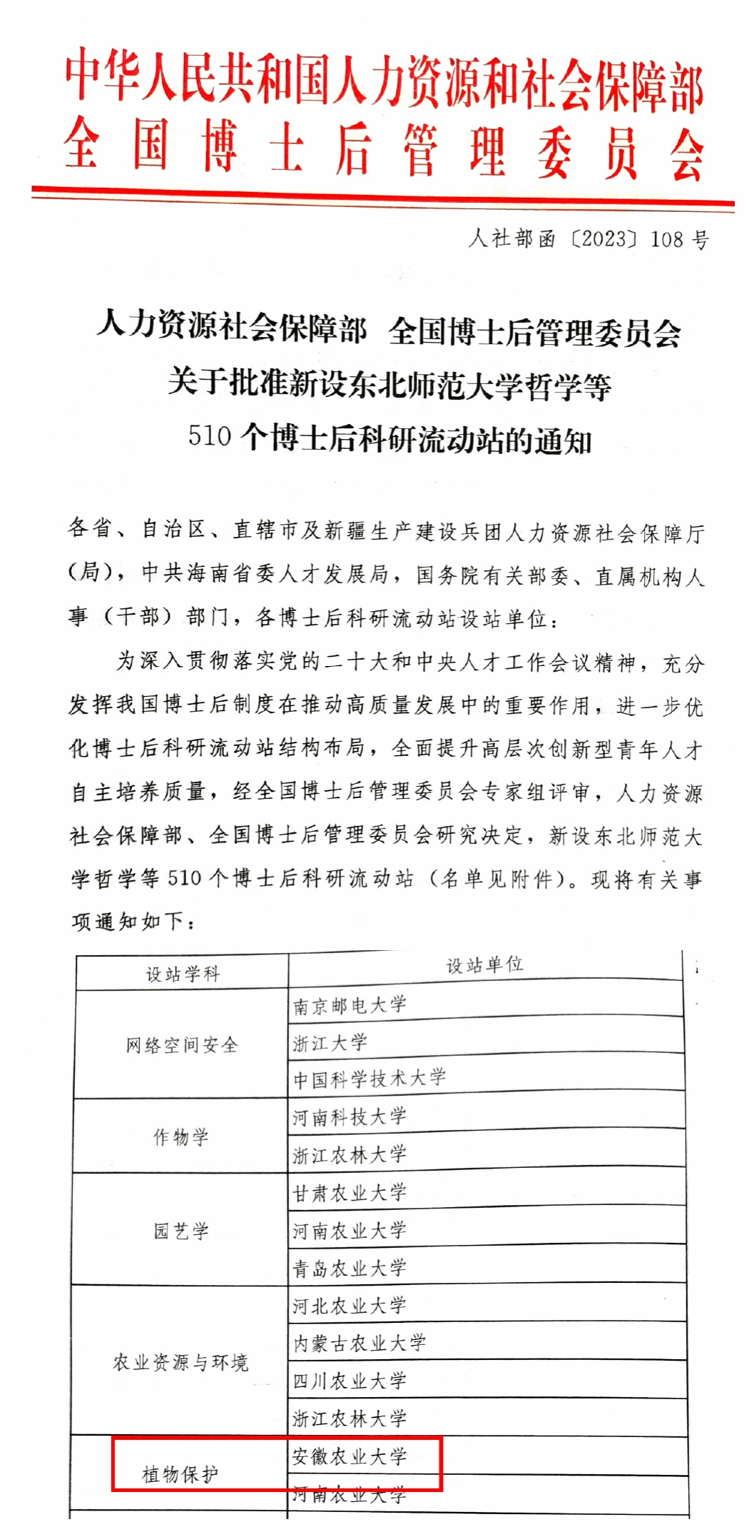 本网讯 近日,人力资源社会保障部、全国博士后管理委员会联合下发了《关于批准新设东北师范大学哲学等510个博士后科研流动站的通知》,批准植物保护学院新设植物保护博士后流动站,这是学院学科建设取得的又一项新突破。
