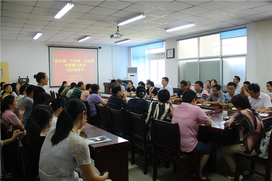 本网讯 7月13日下午,生命科学学院召开全体党员大会,学习传达我校“讲忠诚、严纪律、立政德”专题警示教育动员大会精神,对本院“讲严立”专题警示教育进行动员部署。会议由学院党委书记张健主持。