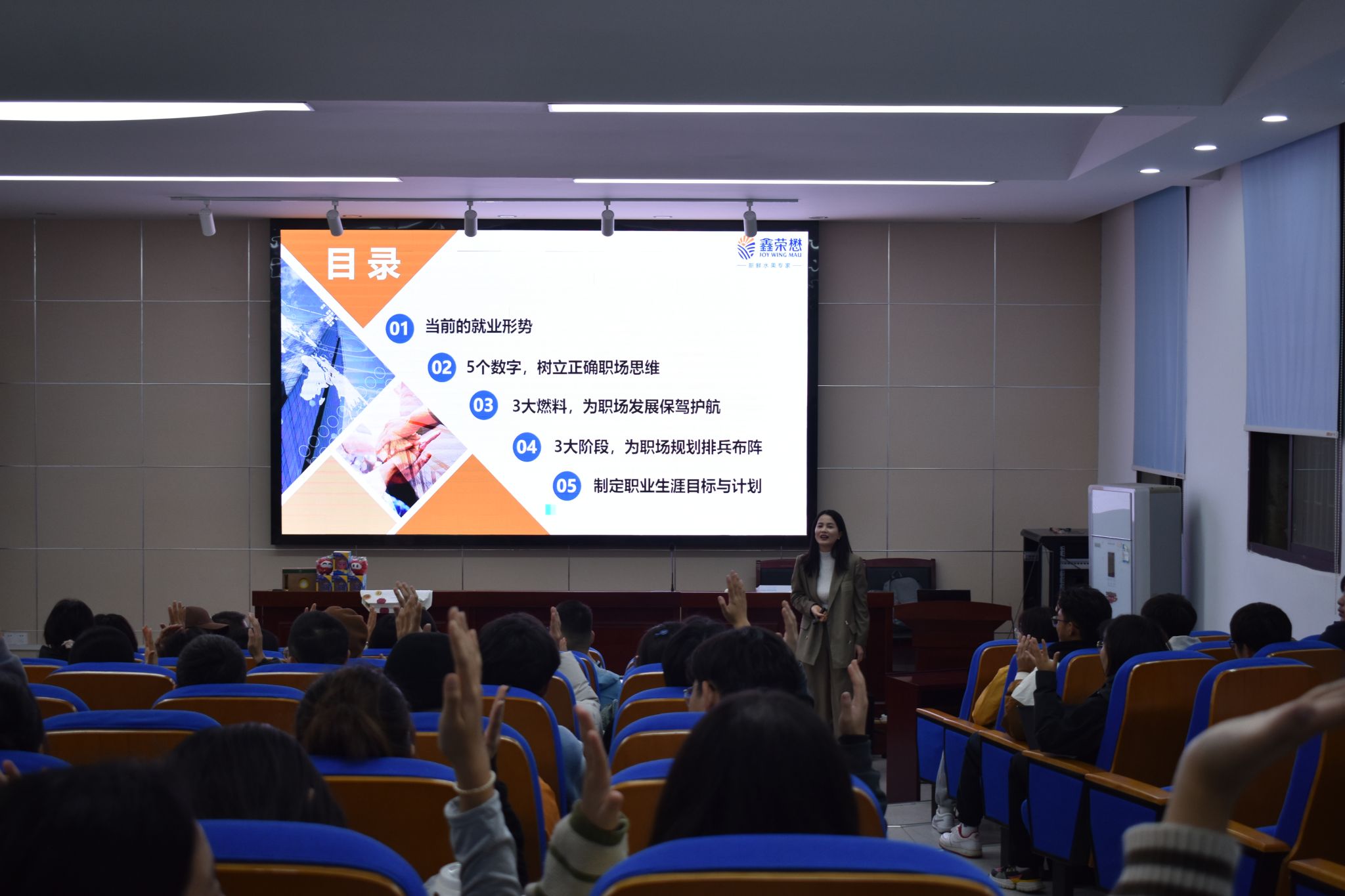 王兰清从经济状况、行业需求、个人能力、就业市场竞争等四个方面分析了当前就业形势。通过5个数字,帮助学生树立“多行动、少忧虑”的正确职场思维。介绍了“可迁移技能”、“有意义的经验”、“持久的关系”等3大“燃料”,在职场发展中保驾护航的作用。详细剖析了“认识自己,强势开局”、“聚焦长板,塑造商业价值”、“寻找机会,发挥持续影响力”等3大阶段,帮助学生为职场规划排兵布阵,制定可行的职业目标与计划。讲座现场气氛热烈,学生与讲座专家互动频繁。
