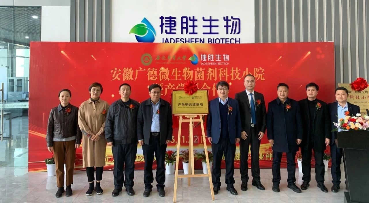 本网讯 11月22日,安徽广德微生物菌剂科技小院暨产学研共建基地揭牌仪式在新杭镇安徽捷胜生物科技有限公司举行,我校与安徽捷胜生物科技股份有限公司成功共建“安徽广德微生物菌剂科技小院”和“产学研共建基地”。