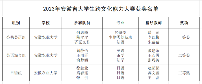 本网讯 近日,由省教育厅主办的2023年安徽省大学生跨文化能力大赛获奖名单公布,我校学生表现出色,获得一等奖、二等奖、三等奖各一项。