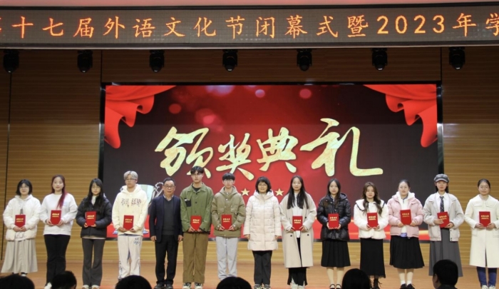 本网讯 2023年12月11日晚,外国语学院“第十七届外语文化节闭幕式暨2023年学生工作表彰大会”在欣苑四楼学生活动中心隆重举行。党委宣传部、教务处、党委学生工作部、团委、外国语学院等部门领导出席活动。全体辅导员、各学院学生分会负责人、2023级全体学生以及获奖学生代表参加活动。