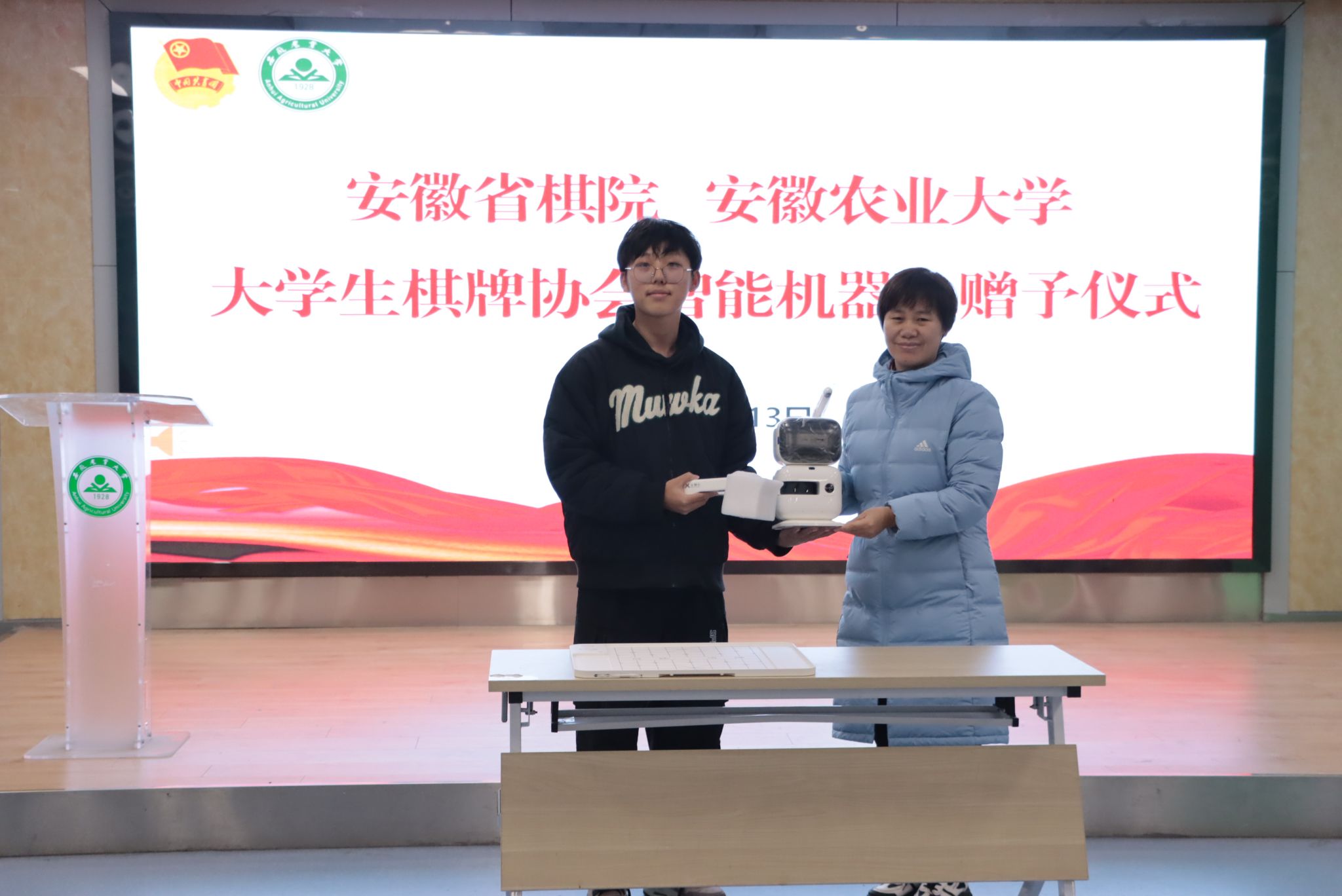 本网讯 12月13日下午,安徽农业大学大学生棋牌协会智能机器人赠予暨2023年棋王争霸赛颁奖活动在大学生创客空间A区路演大厅顺利举行。安徽省棋院院长赵冬、校团委负责同志、校大学生棋牌协会指导教师及学生代表共50余人参加。