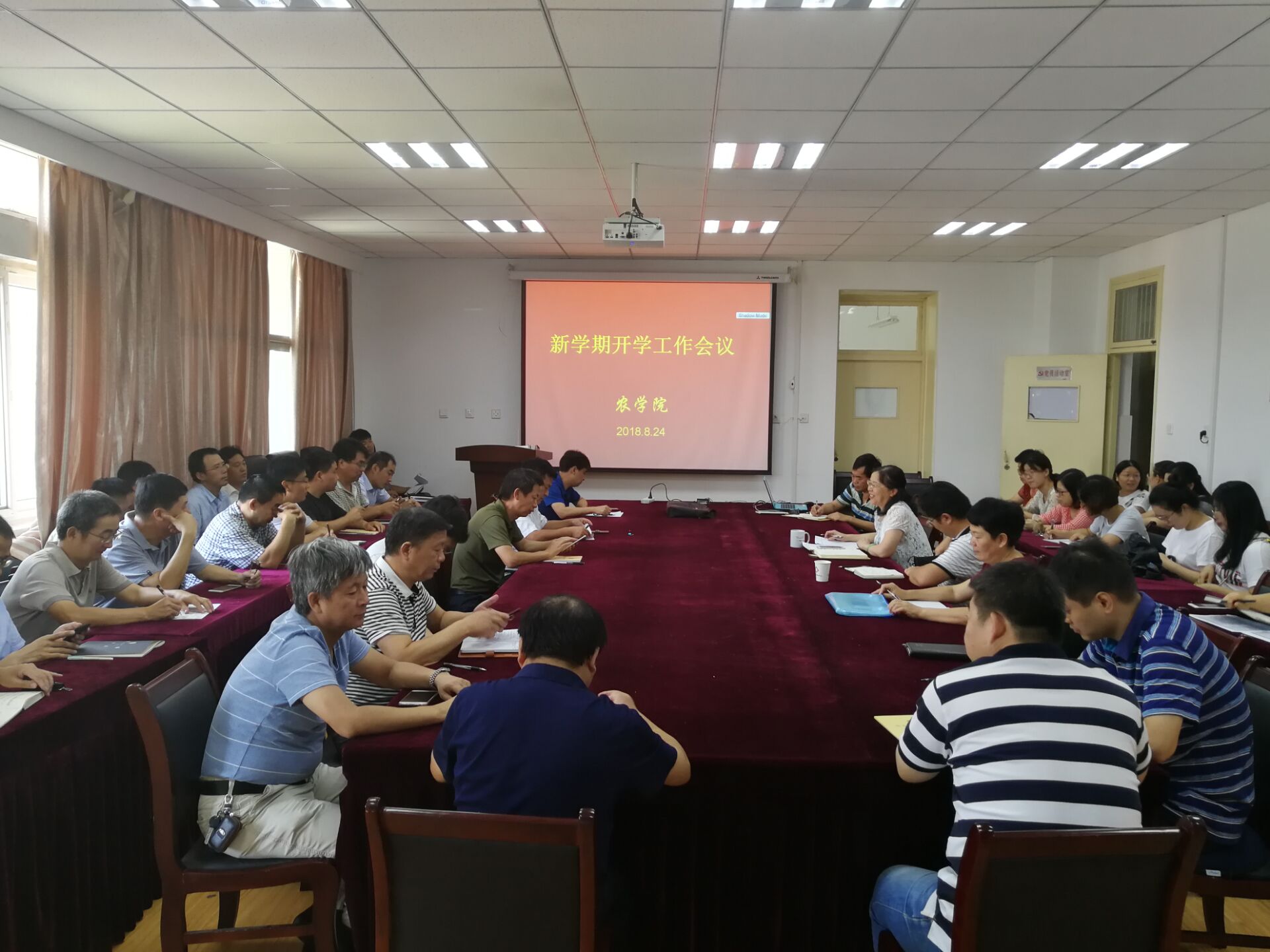 本网讯8月24日上午,农学院召开全院教职工大会部署新学期工作。会议由学院党委书记汪凤莲主持,学院领导班子成员及全院教职工参加会议。