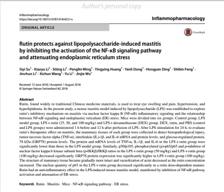 本网讯近日,动物科技学院2015级动物医学专业本科生苏思毅、李小玉以第一作者,在Infammopharmacology上发表题为“Rutin protects against lipopolysaccharide?induced mastitis by inhibiting the activation of the NF-κB signaling pathway and attenuating endoplasmic reticulum stress”的论文。文章通过建立脂多糖诱导的小鼠乳腺炎模型,探讨了芦丁通过NF-κB信号传导途径抑制乳腺炎的作用机制及其与内质网应激的关系,提出了芦丁具有治疗乳腺炎及其他炎症性疾病的潜力。