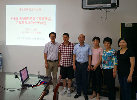 本网讯8月27日下午,我院举行了师资博士后出站报告评审会。赵静博士作了题为《FVEOBI转录因子调控草莓果实丁香酚代谢的分子机理》的博士后出站报告。报告评审会由院学术委员会主任主持。