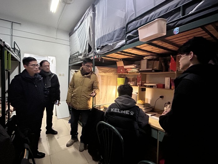 走访慰问过程中,学院领导详细了解了同学们的考研情况和元旦假期安排,与同学们亲切交流。勉励大家要调整好身心状态,提前做好期末考试周的复习备考工作和就业安排,叮嘱同学们要严格执行宿舍安全管理规定,在宿舍内严禁存放或使用各类违禁大功率电器,禁止外来人员留宿,确保假期学生宿舍安全,遇到问题要及时和辅导员或学院反馈。