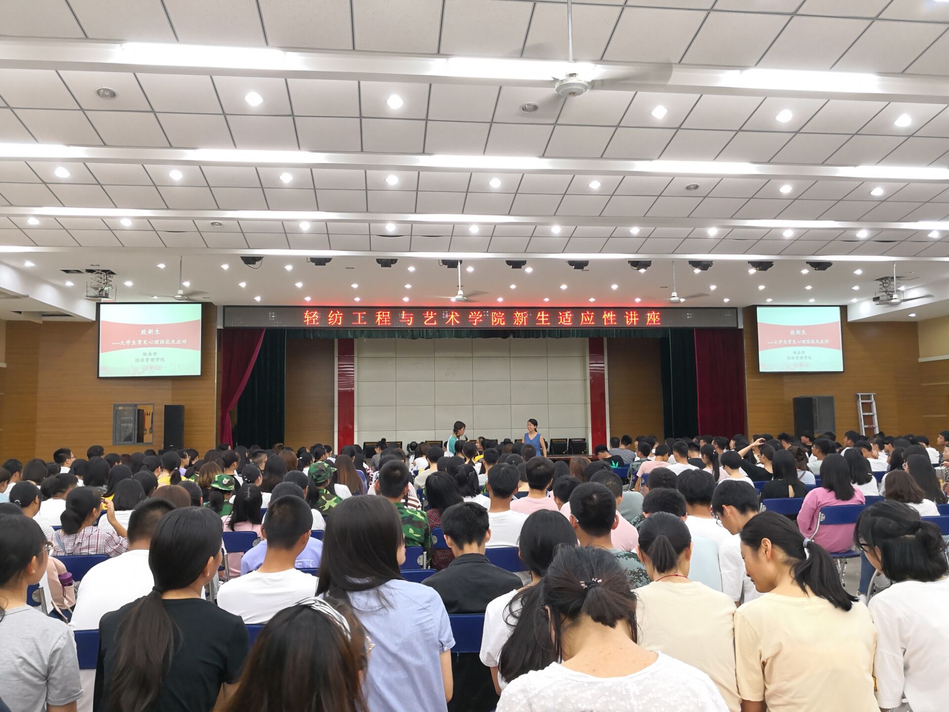 本网讯 9月6日晚,轻纺工程与艺术学院在校大学生活动中心举办新生适应性教育讲座。讲座由经济管理学院杨金丹老师主讲,我院全体2018级新生参加了讲座。