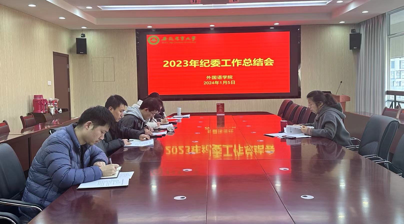 本网讯 1月5日下午,外国语学院在外语楼506会议室召开2023年纪委工作总结会,学院纪委委员、党支部纪检委员参会,会议由院党委副书记、纪委书记、副院长姬惠惠主持。