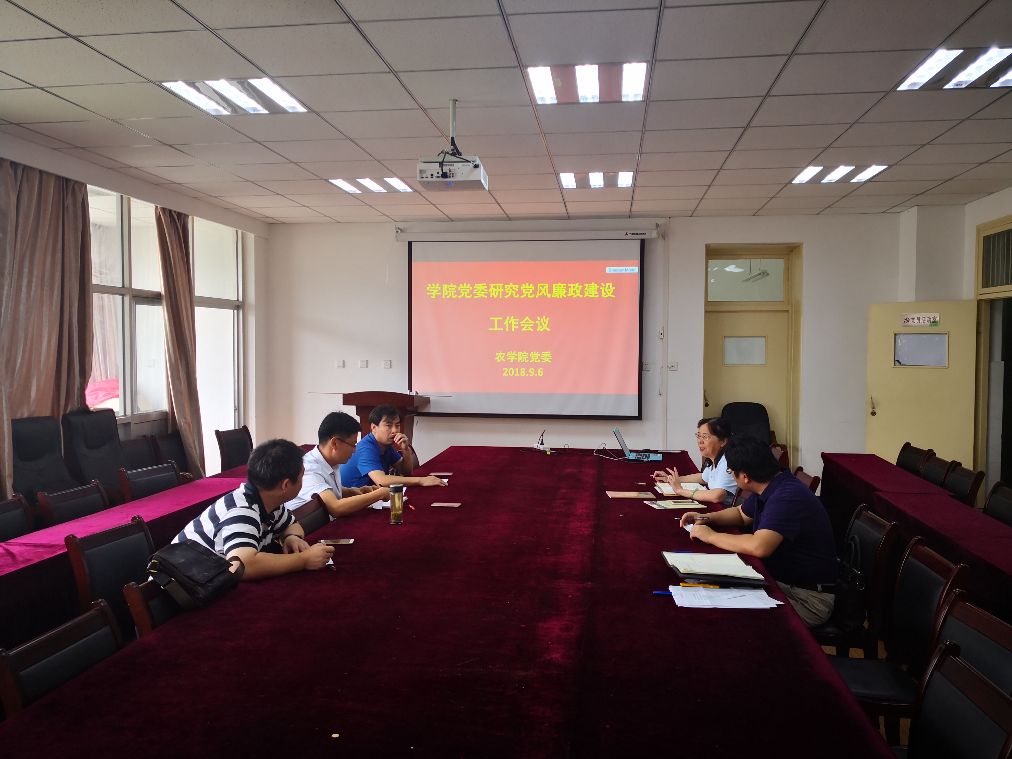 本网讯 9月7日上午,农学院党委召开2018年下半年党风廉政建设工作专题会议。会议由院党委书记汪凤莲主持,院党委班子成员参加会议。
