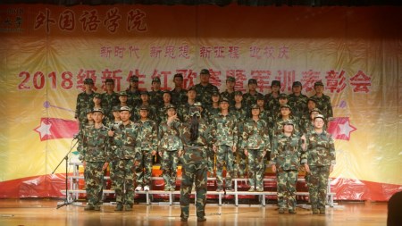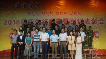 本网讯 9月14日晚,外国语学院“新时代新思想新征程迎校庆2018级新生红歌赛暨军训表彰会”在欣苑四楼大学生活动中心举行。学工(部)处处长彭庆刚、团委副书记任琪、武装部副部长宋齐、外国语学院党政领导孙志农、黄庆华、张剑韵及全体新生班主任出席活动,部分兄弟学院辅导员及飞扬音乐社负责人应邀担任评委,学院全体2018级新生参加了活动。