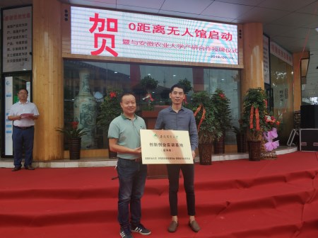 本网讯 9月16日,农学院青年农场主试验班与安徽霍山易达丰电子商务有限公司创新创业实训基地签约挂牌仪式在霍山县0距离无人馆举行。霍山县副县长朱静,我校农学院党委副书记、副院长鄢高翔,霍山县商务局、团县委等领导参加霍山0距离无人馆开馆及创新创业基地授牌。