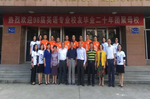 本网讯 在学校校庆即将来临之际,10月4日下午,外国语学院英语专业首届(98届)本科生汇聚母校,与当年的老师欢聚一堂,共叙师生之情,共话同窗之谊。原文理学院党政领导尤德胜、黄邦汉、张宪平、徐亚华、朱绍友和班主任唐红萍以及授课老师等参加了此次活动,外国语学院院长孙志农应邀出席座谈会。