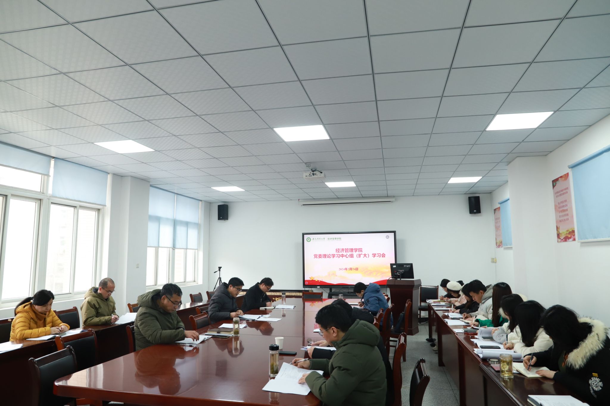 本网讯 2月26日下午,经济管理学院在经管楼304会议室召开党委理论学习中心组(扩大)学习会。学院领导班子、党委委员、党支部书记参加会议。会议由学院党委书记吴国卿主持。
