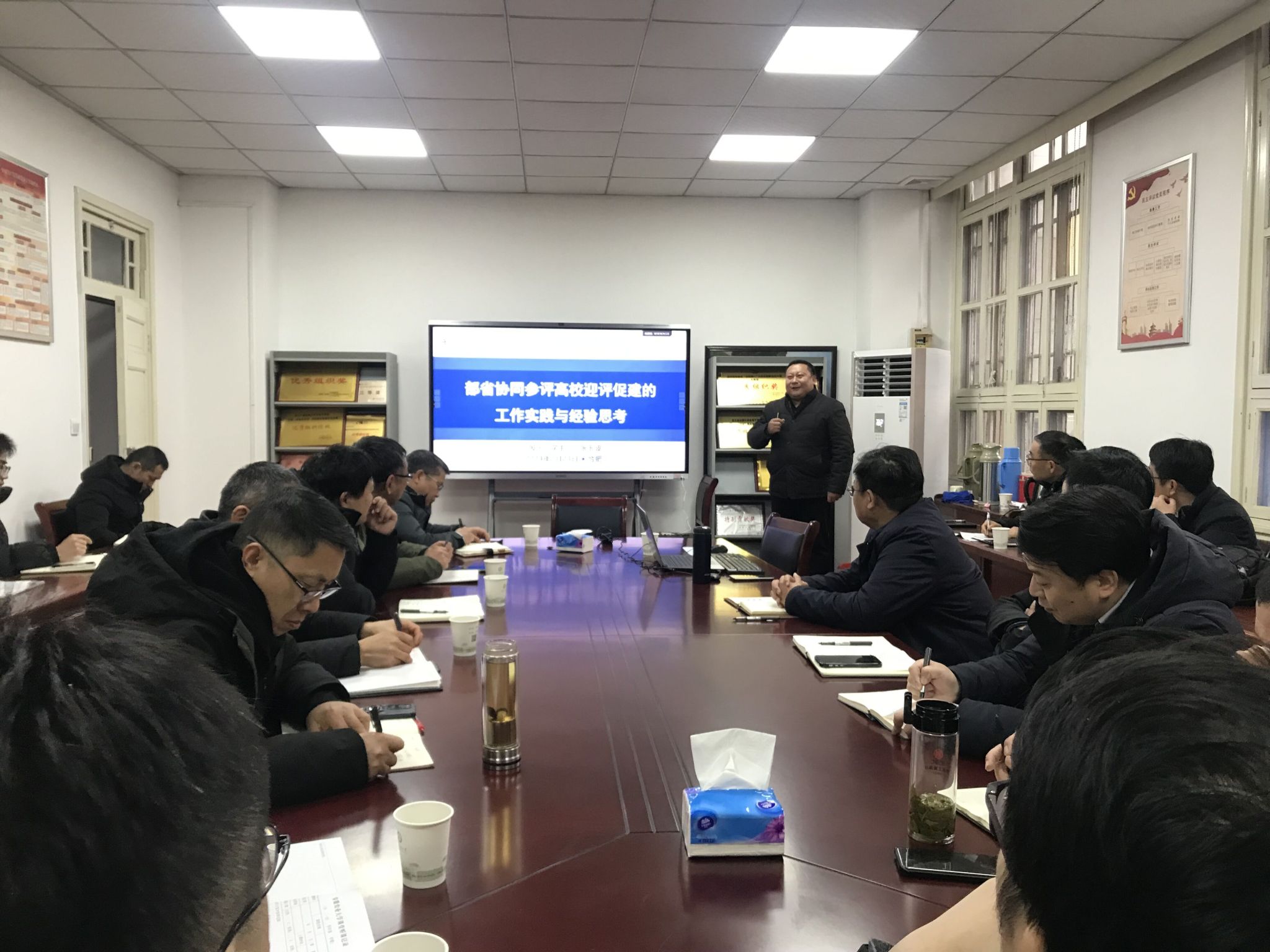 本网讯 为扎实推进本科教育教学审核评估迎评促建工作,2月23日下午,教务处邀请安徽建筑大学高等教育研究所副所长兼发展规划处副处长、评建办副主任张玉波作第三次专题培训,各二级单位教学副院长、教学秘书、教务处各科室成员、审核评估办公室成员等参加会议,会议由教务处处长江海洋主持。