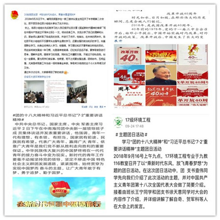 为深入学习宣传贯彻习近平新时代中国特色社会主义思想和党的十九大精神,引导广大团员青年回顾四十年来我国改革开放走过的伟大历程和取得的巨大成就,9月25日—10月10日,资源与环境学院各团支部围绕“我与改革共成长 青春奋斗正当时”开展了形式多样的主题团日活动。研读经典 讨论中挺起时代脊梁