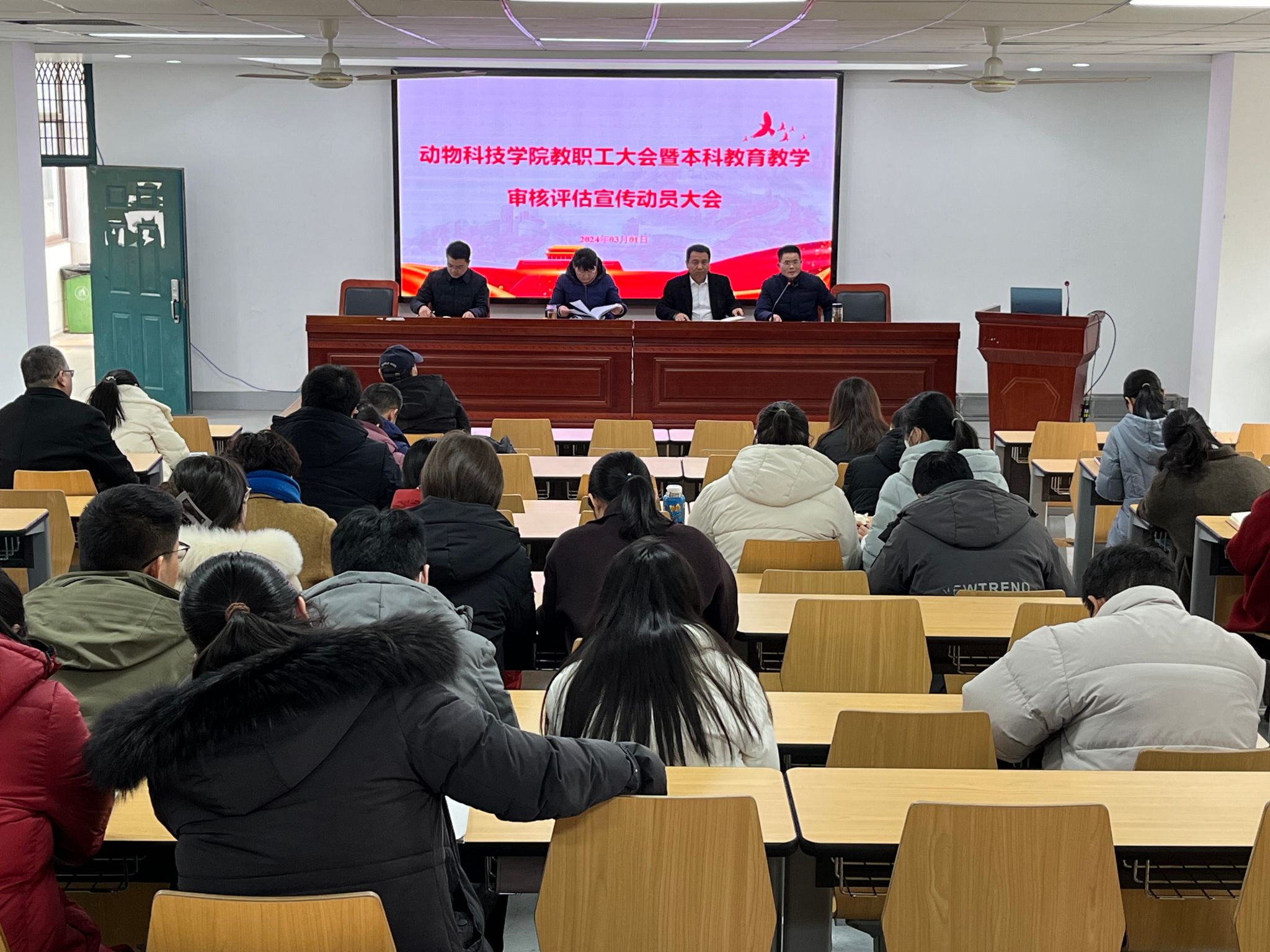 本网讯 3月1日,动物科技学院召开教职工大会暨本科教育教学审核评估动员部署大会,会议分阶段由学院党委书记沈兆梅和院长张子军主持。
