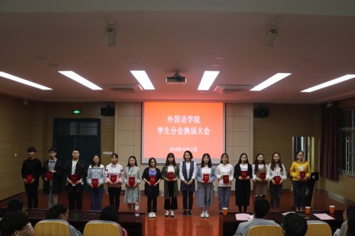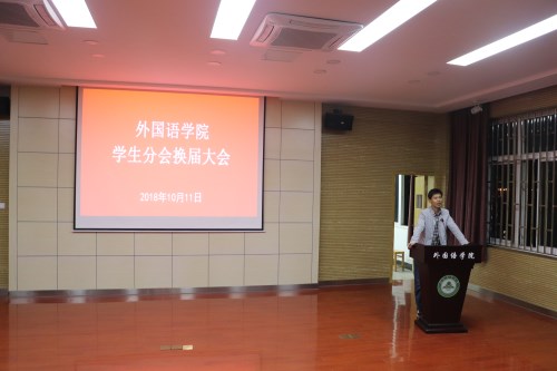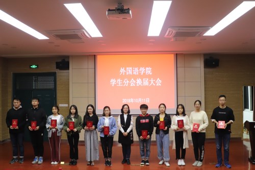 本网讯 10月11日下午,外国语学院在外语楼502多功能厅召开学生分会换届大会,学院党委副书记黄庆华、全体辅导员和第14届学生分会优秀干部代表及第15届学生分会全体成员参加了此次大会。