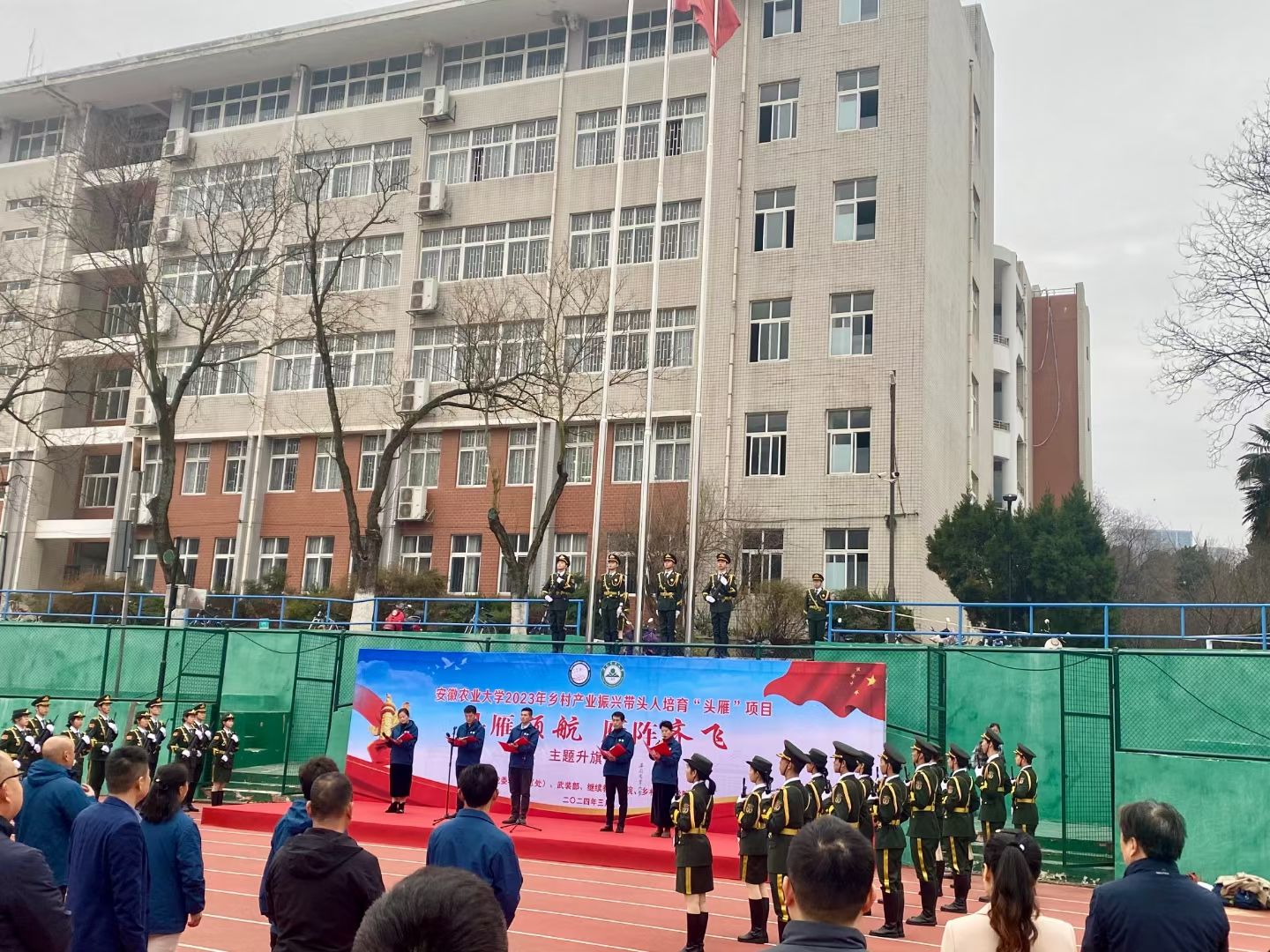 本网讯 3月4日,继续教育学院2023年乡村产业振兴带头人培育“头雁”学员“头雁领航 雁阵齐飞”主题升旗仪式在第一运动场举行。校党委学工部、武装部,乡村振兴学院、继续教育学院等单位负责人,2023年“头雁”孵化指导团团长、班主任和全体学员参加了仪式。仪式由继续教育学院负责人主持。