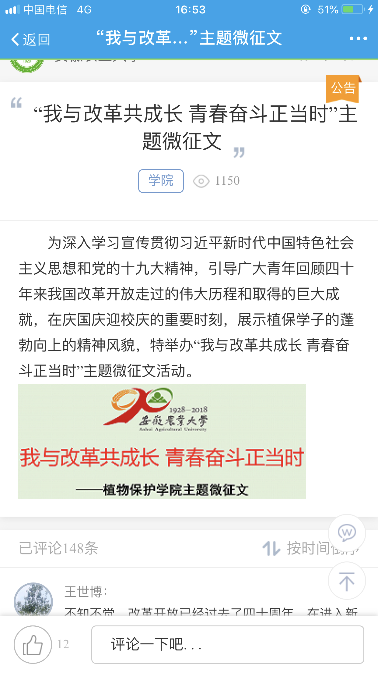 近日,植物保护学院认真落实学校有关文件精神,精心谋划,组织全院各团支部开展以“我与改革共成长 青春奋斗正当时”为主题的系列团日活动。