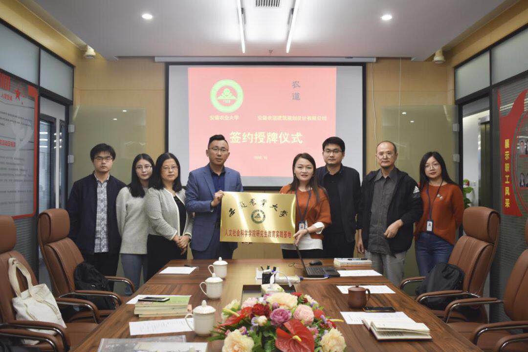 本网讯 10月17日,人文社会科学学院副院长、农村发展学科点负责人方国武率师生一行4人赴安徽农道建筑规划设计有限公司举行研究生教育实践基地签约挂牌仪式,这是人文社会科学学院农村发展学科点建立的第一个研究生教育实践基地。