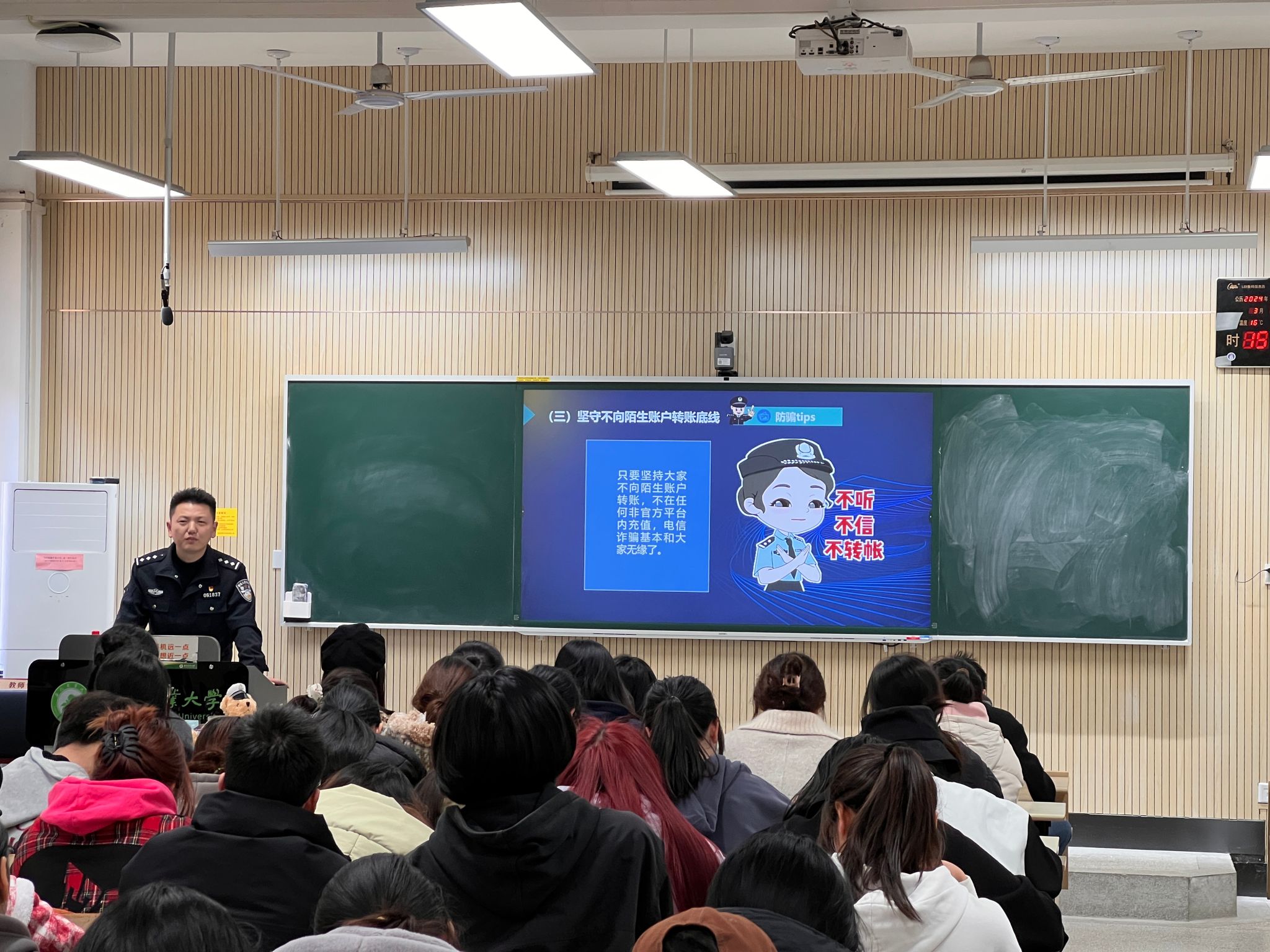 此次讲座内容丰富,案例详实,受到了同学们的一致好评。大家纷纷表示,通过此次讲座,进一步提高了对电信网络诈骗犯罪的防范意识,积极将所学知识运用到实际生活中,为构建平安校园贡献自己的力量。学院将继续加强与辖区派出所的合作,定期开展安全主题教育活动,协力共筑“安全墙”,全力保障师生生命健康和财产安全。(文图/刘云 编辑/张智勇 预审/单国雷 审核/郑雪林)