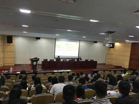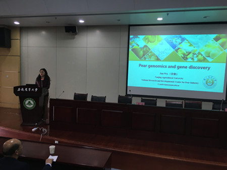 吴俊向与会师生作了题为“梨基因组与品质性关功能基因研究”的报告。报告着重介绍了梨的背景、梨的遗传多样性,重点阐述了影响梨石细胞相关基因和梨着色转录基因调控基因等方面。