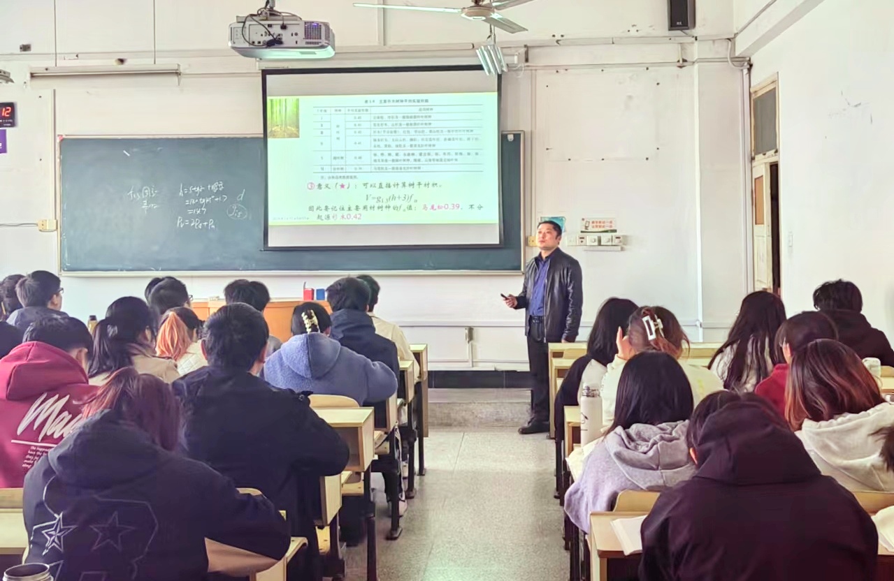 “开展植树造林,是深入贯彻习近平生态文明思想、践行‘两山’理论的重要举措,植树造林不仅能有效增加区域生物多样性、保护水土资源、助力生态平衡,同时还能增加森林固碳能力,减缓全球变暖……”3月12日上午,植树节当天,在勤学楼412教室,林学系教师吴文友正在为22级林学专业开展《测树学》课程教学,他从习近平生态文明思想讲起,勉励林学学子扎实学好专业知识,助力徽风皖韵和美乡村建设……