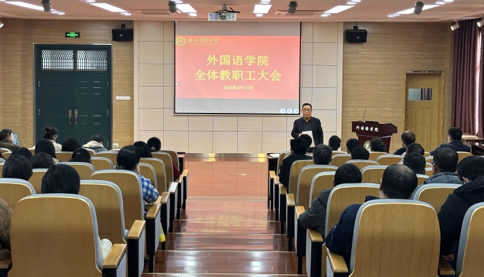 本网讯 3月13日下午,外国语学院全体教职工大会在外语楼502多功能报告厅举行。学院党委副书记姬惠惠,副院长许宗瑞、张文静和全体教职员工参加了会议。会议由学院党委书记何如海主持。