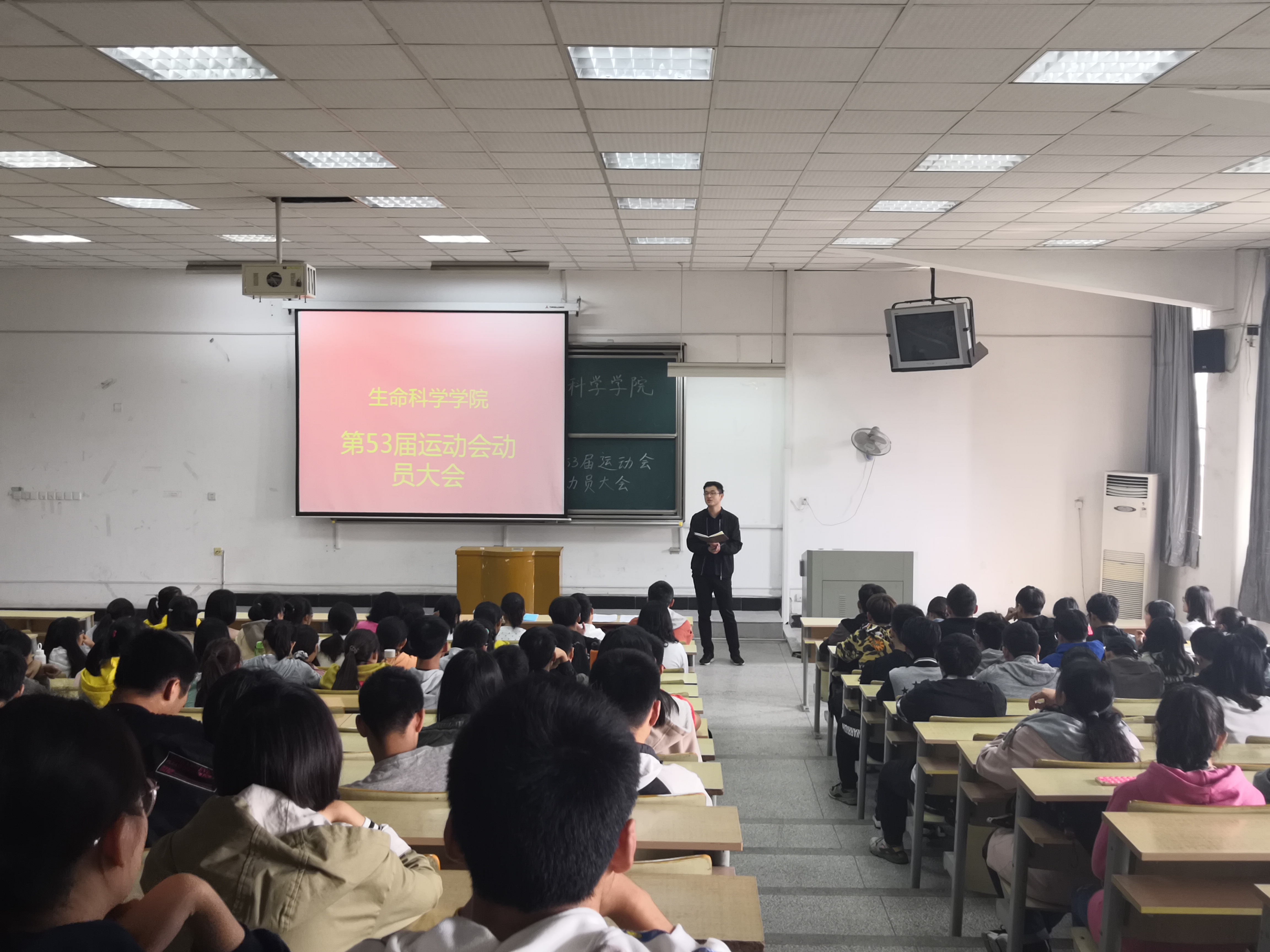 本网讯 10月23日中午,生命科学学院在九教527教室召开校第53届运动会动员大会,学院团委老师出席并作动员讲话,全体运动员及学生会各部门成员参加了此次大会。