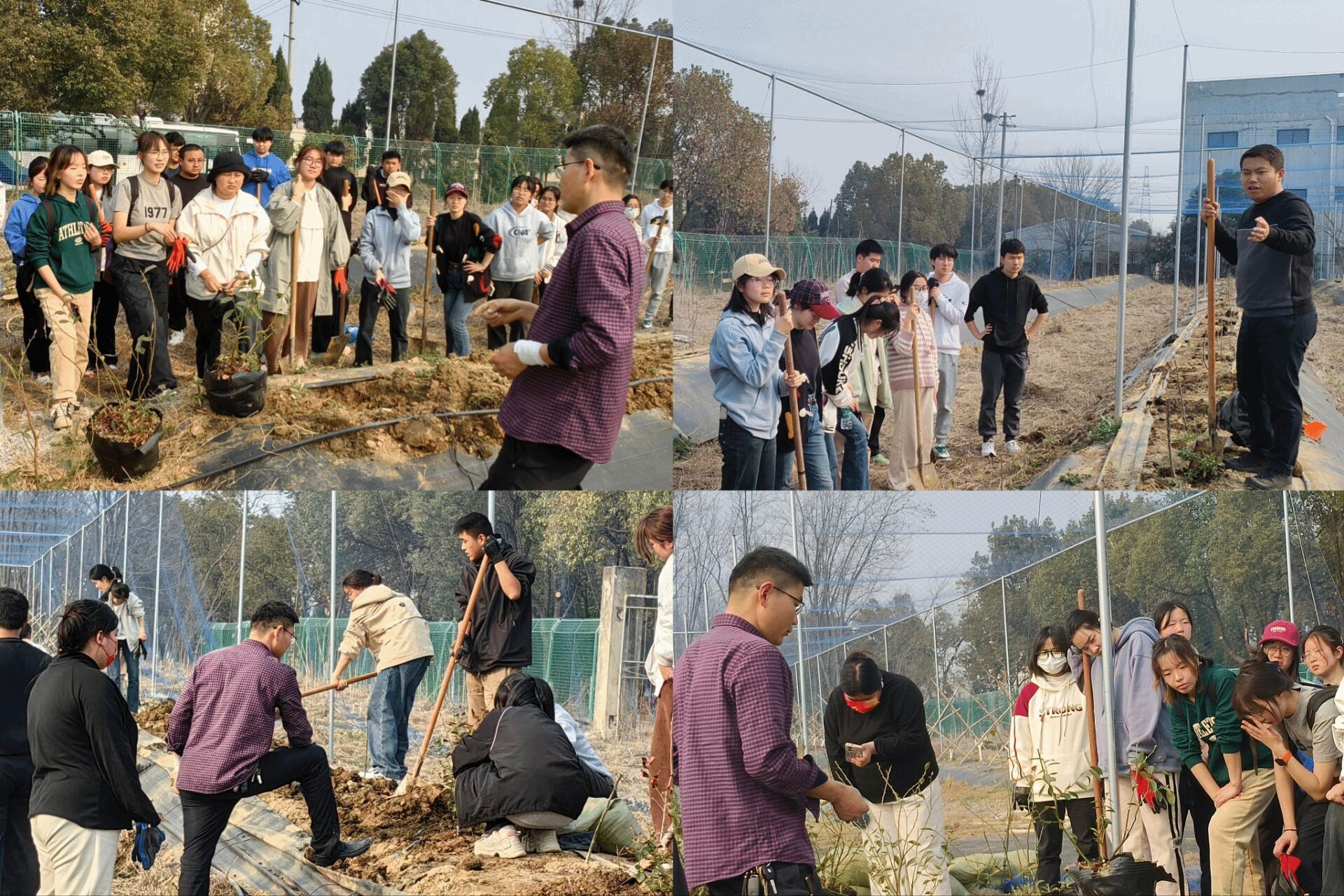 “蓝莓,喜酸性土壤,根系浅,坑深40cm即可……”现场老师刚说完要求,同学们就迫不及待地干起活来。师生们分组合作,同场竞技,每每种好一株果树,同学们都感到满满的成就感,即使铲子断了、手起泡,也无人放弃,师生们热闹的身影汇成了一幅忙碌的春耕图景。