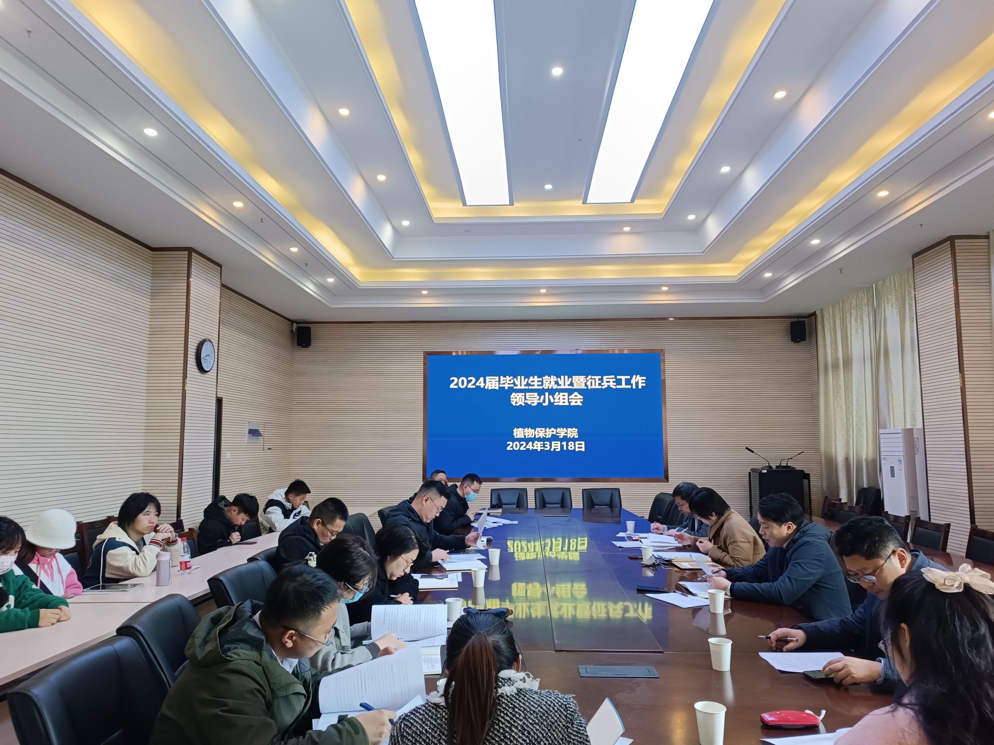 本网讯 3月18日下午,植物保护学院在中西部综合楼1213会议室召开2024届毕业生就业暨征兵工作领导小组会。学院党政领导,系主任,毕业班辅导员,教学、科研与研究生秘书,2021级辅导员,全体毕业班班级就业联络员参加会议,会议由院党委副书记汪小强主持。