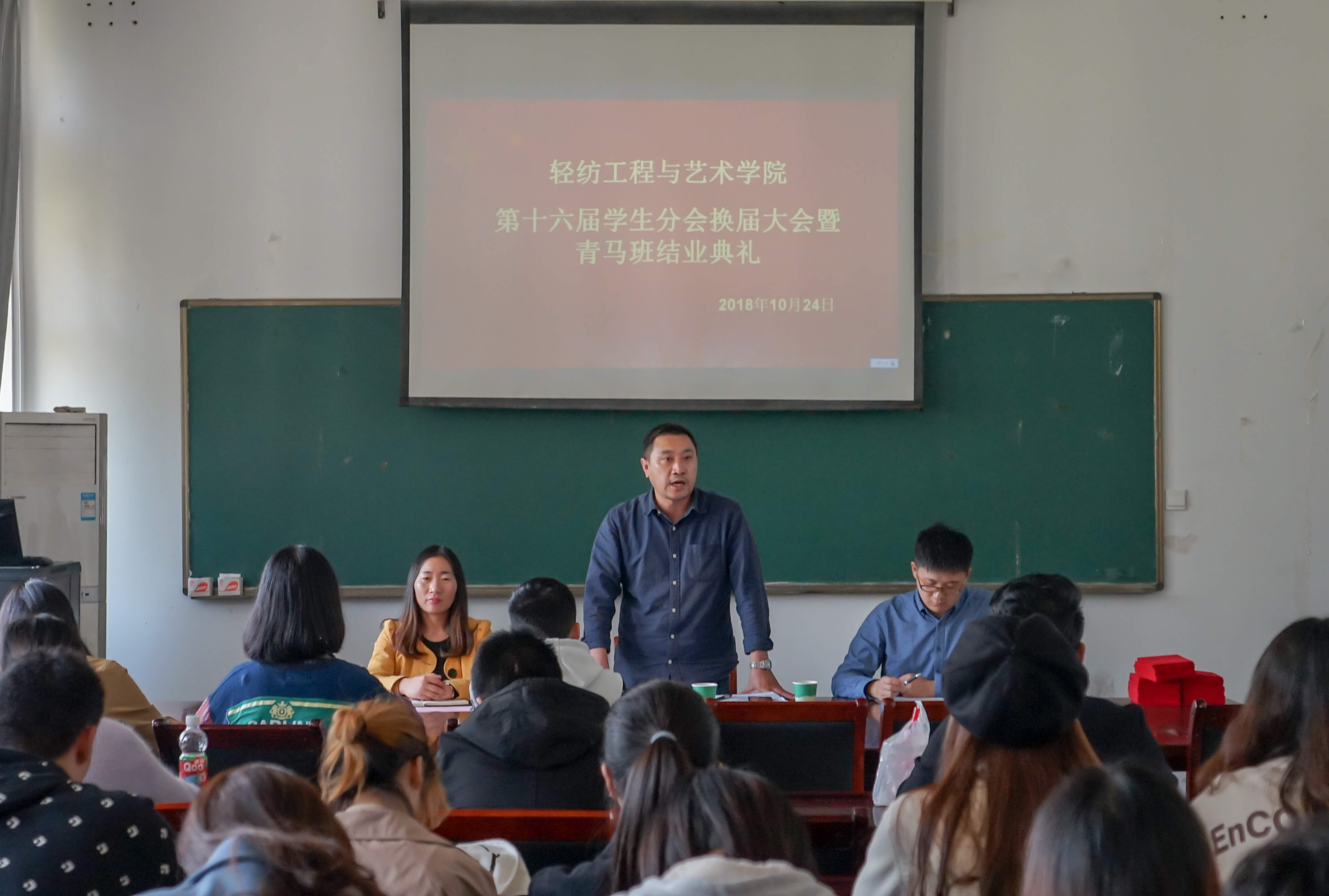 本网讯 10月24日,轻纺工程与艺术学院在轻纺楼四楼举办第十六届学生分会换届大会暨院“青马”班结业典礼。学院党委副书记吕剑秋、团委老师出席了会议,院学生会干部、“青马”班成员参加了本次活动。