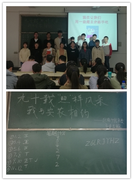 线下活动热情高涨,10月23日下午,班级在学院105教室召开了“九十载‘照’样风采——我与安农相约”的主题班会,班会以知识竞赛的形式进行。竞赛前,班长向班级同学播放了校庆宣传视频,介绍了学校的历史沿革、取得的成绩并讲解了校徽的意义,学习之后进行分组竞赛答题,对得分最高的小组给予奖励。经过解读学习、竞赛,最终全班完成了易班系统的竞赛答题,充分发挥了以考促学的作用。本次比赛气氛活跃,效果显著,深入了解学校的同时,更加强了班级同学之间的凝聚力。
