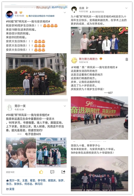 为庆贺学校90周年华诞,自10月接到关于开展90周年校庆主题教育月活动的通知以来,信息与计算机学院2018级电子信息类3、4、5班班委积极筹备组织,借助主题系列活动带领班级同学回顾学校发展历程、展示办学成就、明确发展方向、培养安农情怀。纸短情长“照”样风采